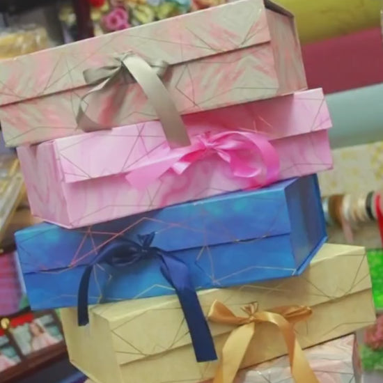 Add elegance to your gifting with our large collapsible ribbon gift box. Crafted with a premium textured finish and a stylish ribbon closure, this spacious box is perfect for creating impressive hampers and luxury gifts.