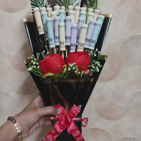 ✔️ Artificial flowers + real cash arrangement